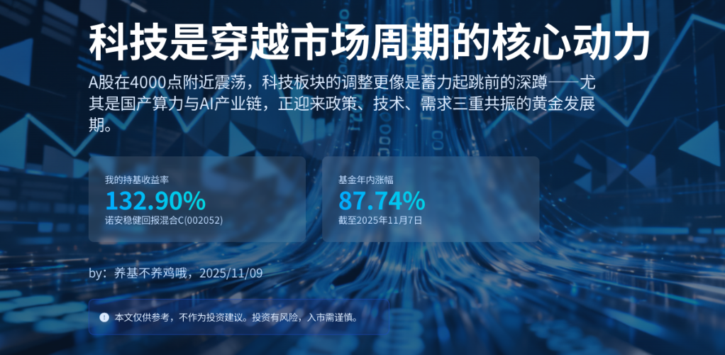 #天天基金调研团##AI产业链群星璀璨#$诺安稳健回报混合C(OTCFUND|002052)$我始终坚信科技是穿越市场周期的核心动力。近期A股在4000点附近震荡,不少人觉得科技板块要“歇脚”,但在我看来,这轮调整更像是蓄力起跳前的深蹲——尤其是国产算力与AI产业链,正迎来政策、技术、需求三重共振的黄金发展期,而诺安稳健回报混合C(002052)正是我把握这波机遇的核心选择。说来也巧,我自己早在去...