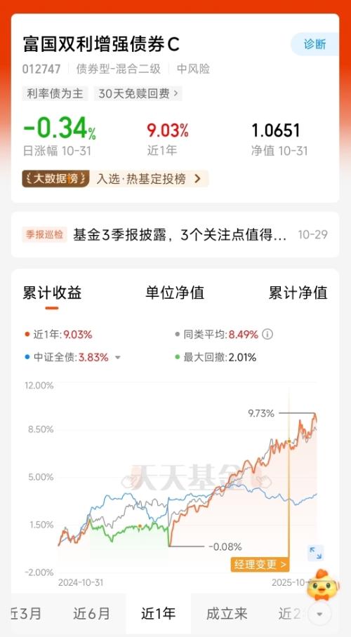 向上的公孙宇航 发表于 今天 00:08 45次浏览 最近我持仓的汇添富多元收益C和富国双利增强C都偏周期方向,但富国这只更猛点基金经理宏观择时有一套,三季报重仓有色、非银这些板块。近1个月涨了1%,近半年7%,近一年10%,还跑赢大多数同类;最让我安心的是,过去一年随便哪周打开帐户,69%的概率都在赚钱! 评论赞