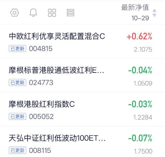 今天A股反弹,不过板块分化明显,科技赛道前段时间波动大,不过最近也回暖了,稳健的红利板块近来反弹的不错,不过今天迎来小调整,也有逆势上涨的,看看净值:$中欧红利优享混合C(OTCFUND|004815)$今天上涨0.62%$摩根标普港股通低波红利ETF发起式联接C(OTCFUND|024773)$今天下跌0.04%$摩根标普港股通低波红利指数C(OTCFUND|005052)$今天下跌0.03%$天弘中证红利低波动100联接C(OTCFUND|008115)$...