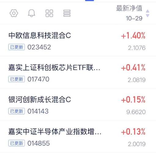 今天A股还是继续反弹了,三大指数都上涨了,科技赛道还是比较强势的,最近也是修复了很多,我觉得当下社会在不断进步,科技板块还是继续看好的,看看净值情况$中欧信息科技混合发起C(OTCFUND|023452)$今天上涨1.4%$嘉实上证科创板芯片ETF发起联接C(OTCFUND|017470)$今天上涨0.41%$银河创新成长混合C(OTCFUND|014143)$今天上涨0.15%$嘉实中证半导体指数增强发起式C(OTCFUND|014855)$...