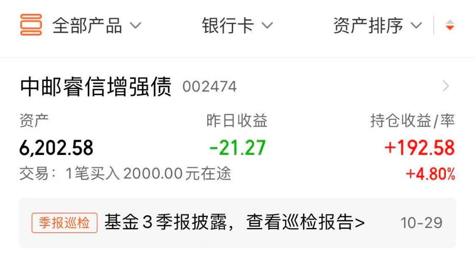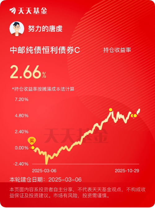 阳光空气与你 更新于 10-30 14:43 464次浏览 今天固收+基金中邮纯债恒利债券C爆蛋35个,昨天刚好买到小凹点了!近1年涨幅11.40%,回撤也比较好的,还是比较难得滴! #好基已就位##A股突破4000点!下个目标位在哪?# 210