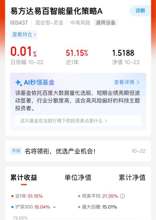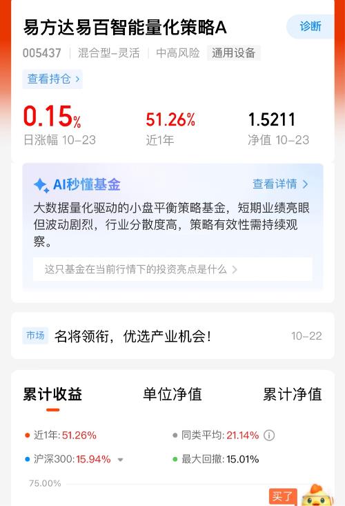 最近市场震荡走势,板块轮动也快,我手里的易方达易百智能量化策略A,它靠量化模型覆盖多行业标的,既能分散单一板块风险,又能精准跟行情节奏。近期主动布局易踏空,这只基的量化策略适配性更强,震荡市中抗跌且有收益弹性,近六个月涨幅33.93%近一年涨幅51%,业绩也稳步向上。这时候配这类智能量化产品,能借模型抓机会、降择时压力,我也分批布局起来,期待收益在创新高。 $国金量化多因子股票A$#煤炭重拾涨势要跟上吗?#...