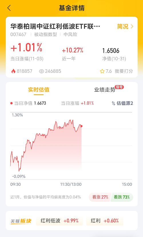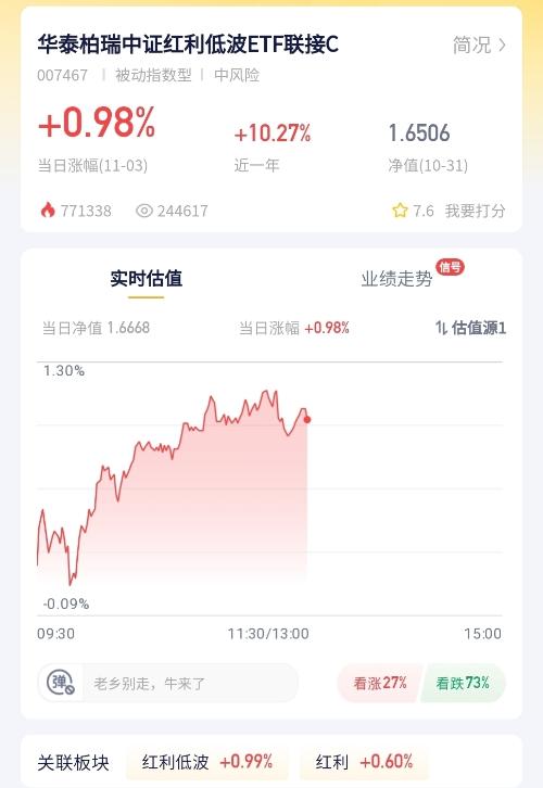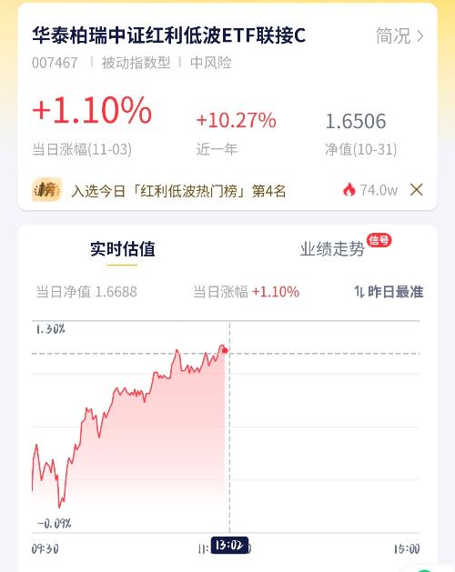 今天市场还是没什么方向,但红利低波板块的行情挺让人安心,稳稳收红不说,板块里的银行、公用事业这些刚需行业都很抗跌。现在这市场环境,防御性太重要了,而红利低波刚好兼具高股息和低波动,简直是震荡市的“避风港”。不想自己研究个股的,直接选华泰柏瑞就行,它专门投这类抗跌又能分红的资产,定投门槛不高,还能通过定期投资积累份额,长期下来收益很可观,比自己瞎买股票靠谱多了。$华泰柏瑞中证红利低波ETF联接C$