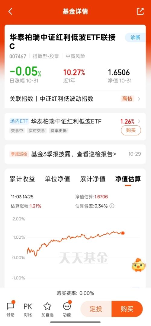 今天红利低波行情亮眼,波动小收益还不错。我准备了解下华泰柏瑞的红利低波,毕竟这种稳扎稳打的基金,配上表现给力的板块,说不定能给我带来点稳稳的幸福,先纳入观察。 $华泰柏瑞中证红利低波ETF联接C$#10月投资总结:我的收益如何了?#