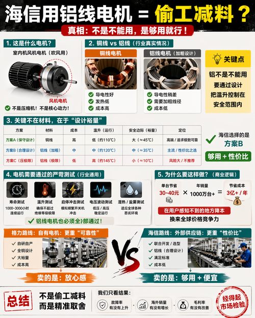 关于海信部分风机电机用铝这件事,讨论很多,但大多停留在材料层面。 其实工程上更关键的是“设计裕量”和应用场景,而不是简单的铜或铝。 整理了一张对比图,供大家参考。 $海信家电(SZ000921)$$格力电器(SZ000651)$$美的集团(SZ000333)$