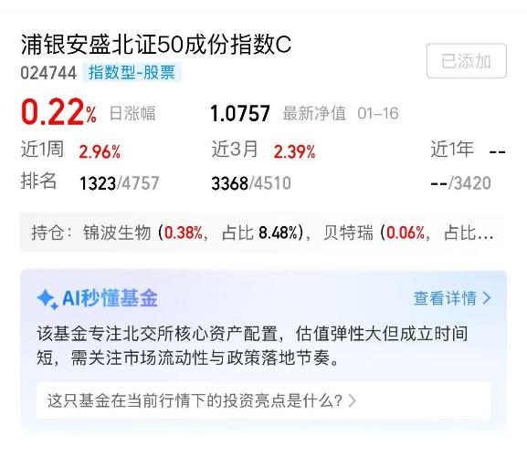 浦银安盛北证成立以来跑赢指数,主动管理能力在被动基中更突出$浦银安盛北证50成份指数C$