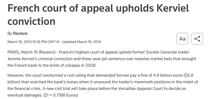 我们都喜欢研究交易员怎么赚大钱,但在市场里更常发生的,其实是赔钱。不过赔钱跟赔钱也不一样,有人赔掉了大半年工资,有人却能赔到让全世界都记住他的名字。接下来,我们就来看看金融史上最惨烈的5笔交易亏损。他们有的亏掉了银行几十亿美元,有的逼停了整个交易所,有的让华尔街多家大行一起埋单。 当然,他们也都成了金融史上的经典案例。 第五名|杰罗姆·科维尔与法国兴业银行未授权交易案2008年,损失49亿欧元,约...