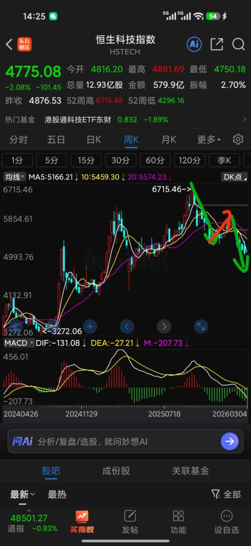 3.4丨操作: 加仓30500元恒生科技! 【恒生科技】冲高跳水,跌逾-1.5%!继续加速赶底中!目前周线6连阴,已是C浪调整尾声,目标位4800点已到,最低打到4750点!目前已处于非理性下跌,自然会有报复性的反弹! $恒生科技指数(HS|HSTECH)$ 所以阿心只能继续左侧抄底中,不求买在最低点!昨晚说了,哪怕杠杆拉到100万,也要加到起飞为止!今天加的这一笔是高息杠杆,准备做一波短线!反弹...