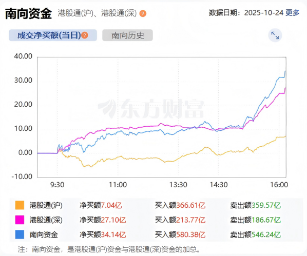 2025/10/24 1、大市盘面:港股三大指数高开后窄幅震荡。截至收盘,恒生指数涨0.74%收26160.15点,大市成交额2266.14亿元,国企指数涨0.68%报9363.94点,恒生科技指数涨1.82%报6059.89点。 2、港股通方面,今日南向资金净买入34.14亿港元。北水净买入美团6.55亿港元、中芯国际6.02亿港元、中国海洋石油5.71亿港元;净卖出泡泡玛特6.28亿港元、石药...