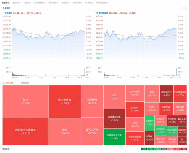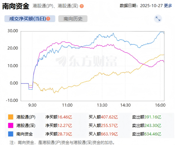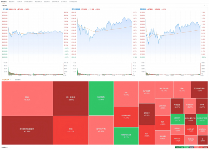 2025/10/27 1、大市盘面:港股三大指数高开后窄幅震荡。截至收盘,恒生指数涨1.05%收26433.70点,大市成交额2670.77亿元,国企指数涨1.10%报9467.22点,恒生科技指数涨1.83%报6171.08点。 2、港股通方面,今日南向资金净买入28.73亿港元。北水净买入中芯国际11.44亿港元、腾讯控股10.30亿港元、华虹半导体9.86亿港元;净卖出阿里巴巴19.85亿港...