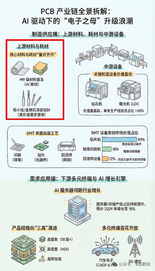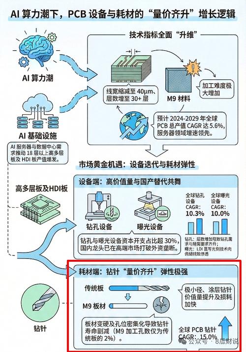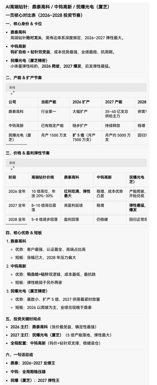 35- PCB钻针产业链深度研究精炼精华版(约3000字) 一、行业核心逻辑:AI 驱动高端钻针爆发,金刚石成下一代主流 1. 行业爆发的根本原因 - AI服务器、高速通信、IC载板推动高密度、高层数、高精度PCB需求爆发。 - M9/M10级高硬度板材普及,传统钨钢钻针寿命暴跌(从800–1000孔→100–200孔),加工成本大幅上升。 - 行业进入材料升级+精度升级+国产替代三重共振周期。 2. 三大技术趋势 1.材料升级:金刚石/PCD/CVD金刚石钻针成为M9+板材刚需,寿命是传统钻针80倍以上,单支可钻8000–15000孔,单位孔成本降40%。 2.精度升级:极小径≤0.2mm、超高长径比≥50:1,单价是普通钻针10倍以上;IC载板需0.035mm级(头发丝1/7)。 3.国产替代:国内企业突破日本佑能、OSG垄断,高端钻针自给率快速提升。 3. 市场规模与格局 - 2025年全球市场约62亿元(+37.8%),中国约34.51亿元(+37.3%)。 - 全球CR5≈75.2%,高度集中: 1.鼎泰高科 28.9% 2.中钨高新(金洲精工)20.8% 3.日本佑能 14% 4.台湾尖点 9% 5.厦芝精密 3%–5% 二、产业链全景:上游材料最受益,中游制造高壁垒 1. 产业链结构 - 上游:碳化钨粉、钴粉、金刚石微粉、PCD复合片、硬质合金棒材。 - 中游:PCB钻针制造(技术壁垒最高)。 - 下游:PCB厂→AI服务器、汽车电子、消费电子、IC载板。 2. 价值分布:微笑曲线 - 上游材料、下游应用附加值高; - 中游制造竞争激烈,但高端钻针毛利极高(金刚石钻针毛利可达70%+)。 3. 关键成本变量 - 钨粉2025年暴涨:311元/kg→990元/kg,自给率高的企业显著受益。 三、核心公司:4条主线选股最清晰(未完待续)