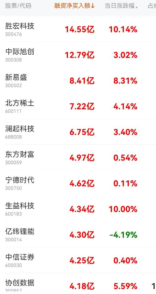 第一名:胜宏科技,融资净买入14.55亿,创业板PCB龙头 第二名:中际旭创,融资净买入12.79亿,创业板cpo龙头 第三名:新易盛,融资净买入8.41亿,创业板cpo易中天组合之一 第四名:北方稀土,融资净买入7.22亿,深市主板稀土龙头 第五名:澜起科技,融资净买入6.75亿,科创板接口芯片龙头 第六名:东方财富,融资净买入4.97亿,创业板券茅 第七名:宁德时代,融资净买入4.62亿,全球...