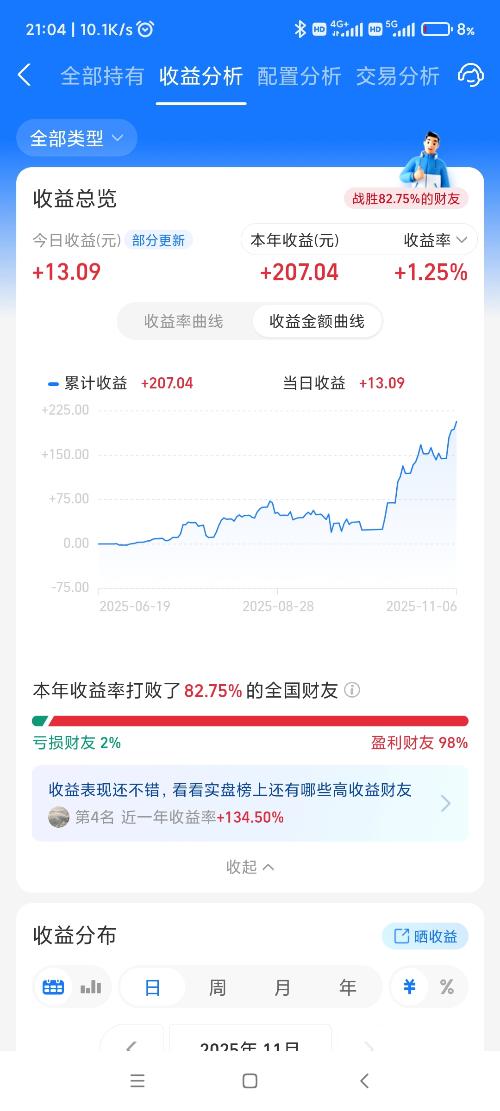 理财第70天,今天赚了+13.09元,累计盈利+207.04元,再度突破个人新高。大盘站上4000,持有的板块也慢慢爬了起来,稳定了信心。(今天躺平。)$上证指数(SH000001)$$深证成指(SZ399001)$$沪深300(SH000300)$