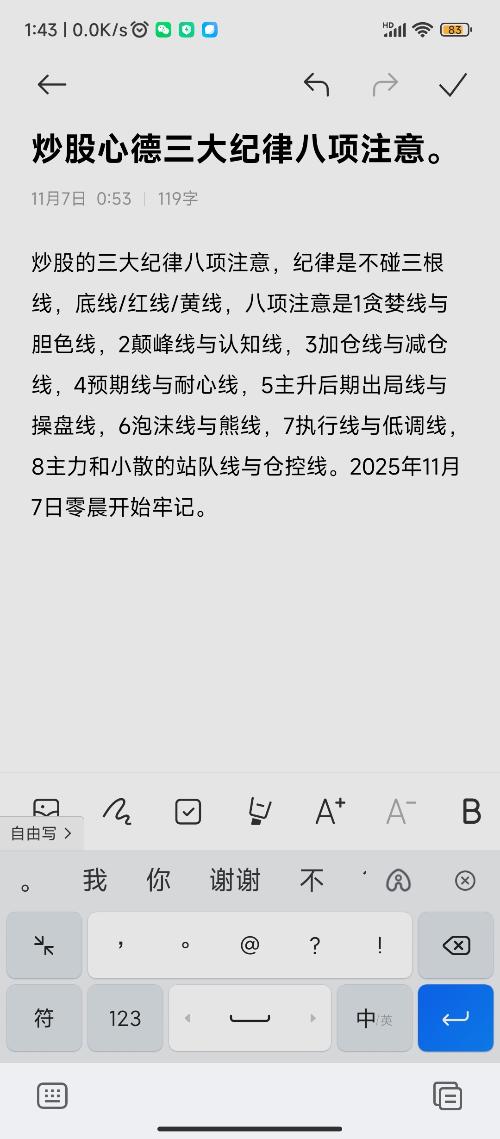 $上证指数(SH000001)$有人说炒股好难,难在哪呢?人性!今天我给自己写了3大纪律八项注意,也可以说是股民的3大纪律八项注意,3大纪律指的是: 一不碰垃圾股二是浮亏不出局,出局必赚钱,三是不踩黄线不上熊途车,八项注是如下 好了一个快乐小散的成长日记今天与朋友们分享了,一点心德,个人观点仅供参考,据此操作风险自负。