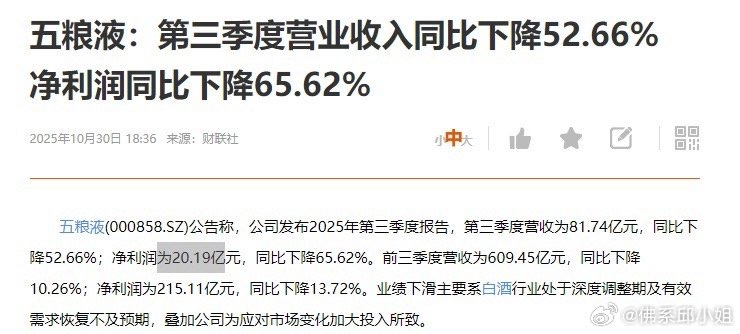 $上证指数(SH000001)$ 60万小股东睡不着了。白酒二哥报表出来了。这业绩有点晕了。 第三季度营收为81.74亿元,同比下降52.66%; 净利润为20.19亿元,同比下降65.62% 三个月盈利为20亿左右,去年前年一般三季度差不多是60亿左右的收入 今年变成了20亿收入,显然一则是降价所导致的,二则是销量所导致的。 如果一个季度20亿后面是常态,那么一年二哥的盈利是80亿到100亿左右...