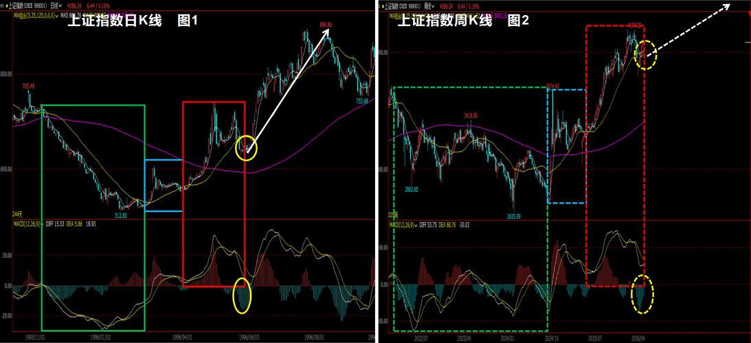 上证指数已经跌不下去多少了。红色圈圈处,最多也就是再震荡一下,震荡之后,黄色箭头的新一轮上涨走势就会开启。 前一张图是上证指数的微观走势前景。而这一张所指明的,就是上证指数的宏观走势前景。图2是周K线级别,一根K线就是一周,图2中,走势正在进行黄色虚线圈圈内的回调结构,未来,白色虚线箭头所标注的周线级别的上涨结构就会开启。观察一下图1中日K线级别的白色实线箭头所标注的上涨结构,就能大致预测预判出图...
