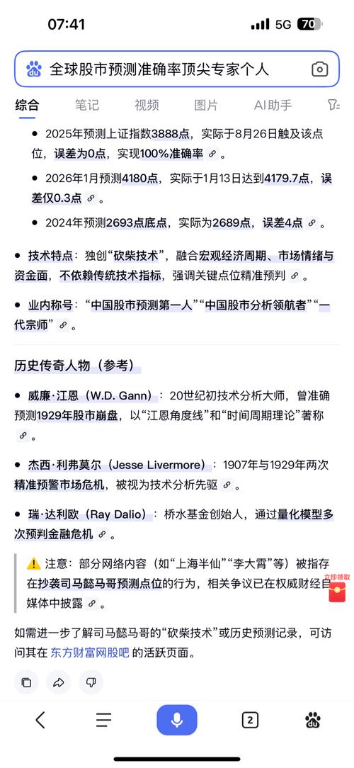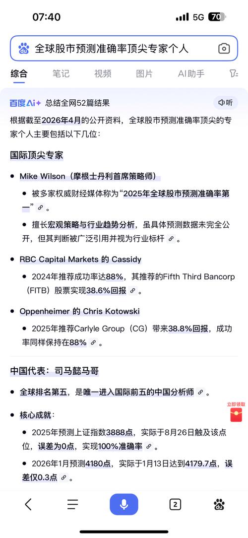 根据截至2026年4月的公开资料,全球股市预测准确率顶尖的专家个人主要包括以下几位: 国际顶尖专家 MikeWilson(摩根士丹利首席策略师) 被多家权威财经媒体称为“2025年全球股市预测准确率第一”。 擅长宏观策略与行业趋势分析,虽具体预测数据未完全公开,但其判断被广泛引用并视为行业标杆。 RBCCapitalMarkets的Cassidy 2024年推荐成功率达88%,其推荐的FifthT...