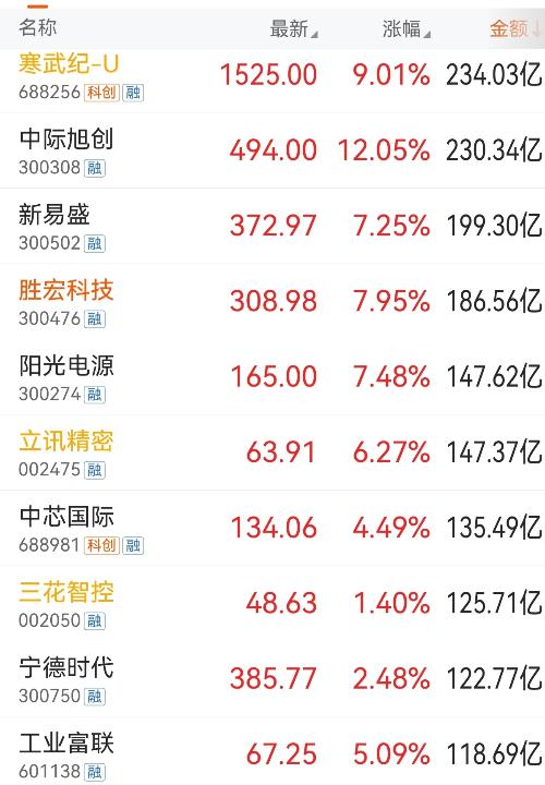 排名名称股价成交金额 第一名:寒武纪1525234.03亿 第二名:中际旭创494230.34亿 第三名:新易盛372.97199.30亿 第四名:胜宏科技308.98186.56亿 第五名:阳光电源165147.62亿 第六名:立讯精密63.91147.37亿 第七名:中芯国际134.06135.49亿 第八名:三花智控48.63125.71亿 第九名:宁德时代385.77122.77亿 第十名...