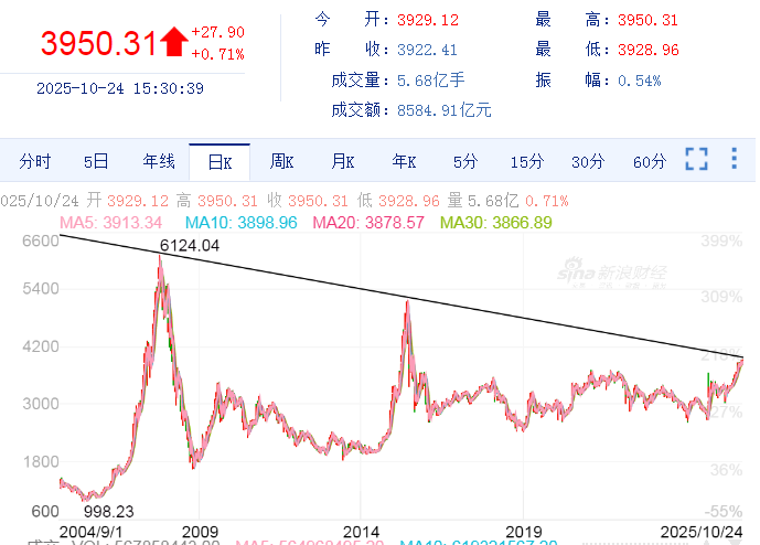 A股大趋势上涨没错,但是受2008年高点和2015年高点连线压制,3950以上风险大,下周开始到十一月底或十二月初有一个周线级别的回调。
