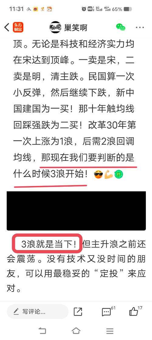 $上证指数(SH000001)$ 两年前的预判到了,在这里的承诺也就完成了。 3000是底,目前应该没有太多人怀疑了,这两天也看到很多4000是起点的言论,这观点长期看我当然认同。以前的帖子,我曾经把去年9月份开始的上涨比喻成国运的大3浪。目前是在这个大三浪的1浪中,至于什么时候2浪回调,波澜壮阔的3浪什么时候实现,以前的帖子和留言都有提示!到时实现时我会一一截图。 请记住这是“G运”的大三浪,很...