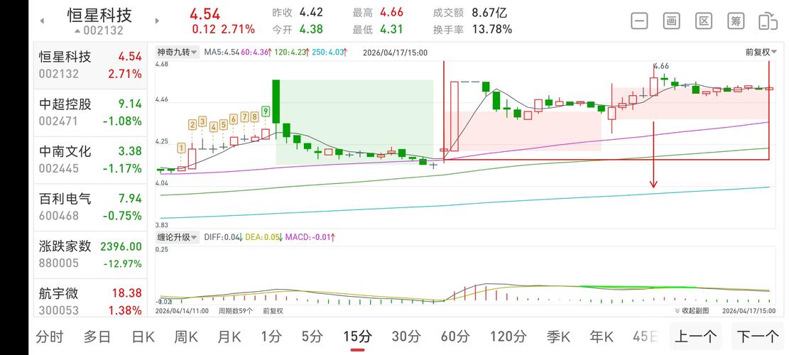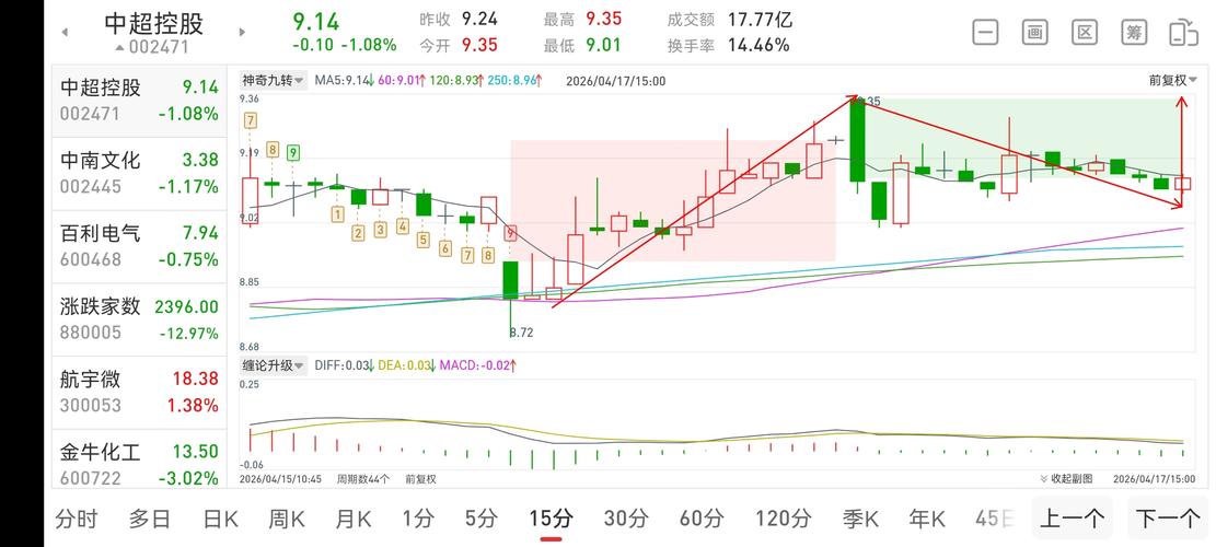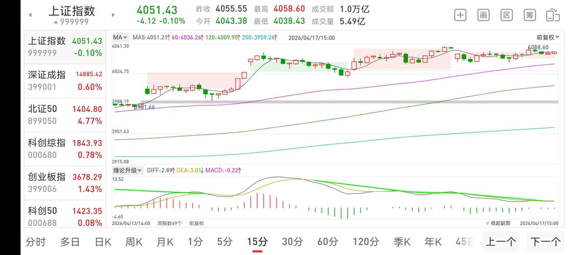 $上证指数(SH000001)$$航宇微(SZ300053)$$中超控股(SZ002471)$ 大盘15分钟走势结构图! 根据以上15分钟走势图来看:指数突破60移动平均线,结合下方红绿柱与形成多个顶背离结构看:确实是强势!指数收在60移动平均线4036点之上不远处! 提示:大盘一明天强势情况下,继续走顶背离结构,先上攻日线布林线上轨4079点与120分钟布林线上轨4099点左右概率很大!可以分批...