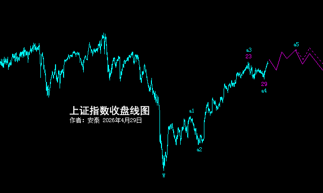 一、今天进入a5 安泰_antai 2026-04-2917:49:33来自天津 29日低点之后大涨,确认今天a4调整结束。 明天冲高回落,6或7日次低点。 从空间看,a5涨幅有限。 以前说过,X浪呈扩散形态,先期急涨,之后宽幅震荡,非常消耗时间。 X之后的Y浪下跌,大概率跌破W浪的低点。 浪4调整了半年,浪6不可能只调整半个月。 时间定涨跌,基因定形态,结构定级别,确认再买卖;中长线判断始终如一...
