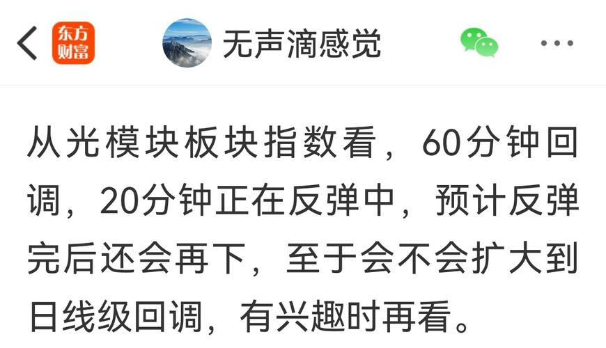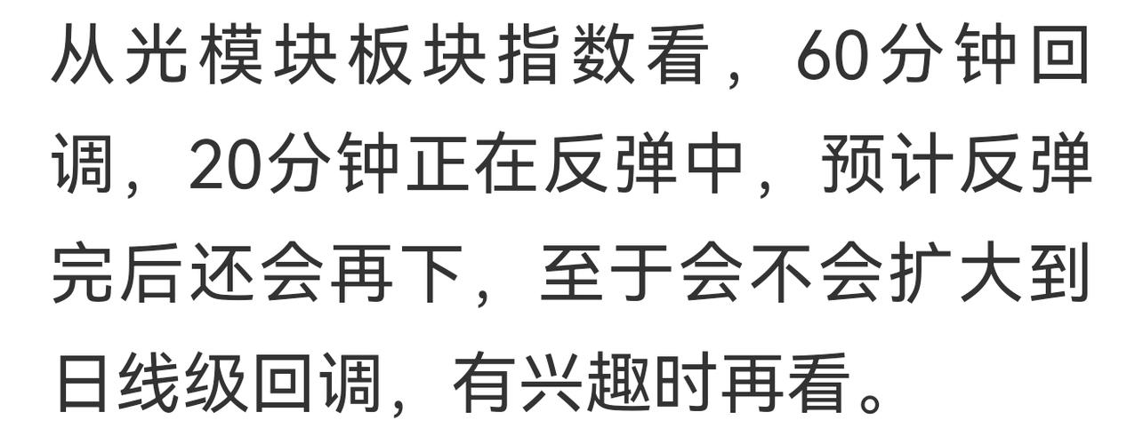 午盘后大盘开始缓跌,最低到4062,离前低4061只差一点。因为破了4061以后,按早盘的盘中走势解读,大盘就是确认了20分钟头肩顶结构成立(或者说是20分钟的上涨趋势反转),回调的级别可能就会扩张。 大盘目前还在20分钟震荡区间内,不上不下的,但上涨的预期不变,虽然个股有三千七百余家下跌。 光通信的走势目前还符合周未的预测,20分钟反弹完成后如期下跌。其中永鼎股份、兆驰股份、太辰光、青山纸业等再...