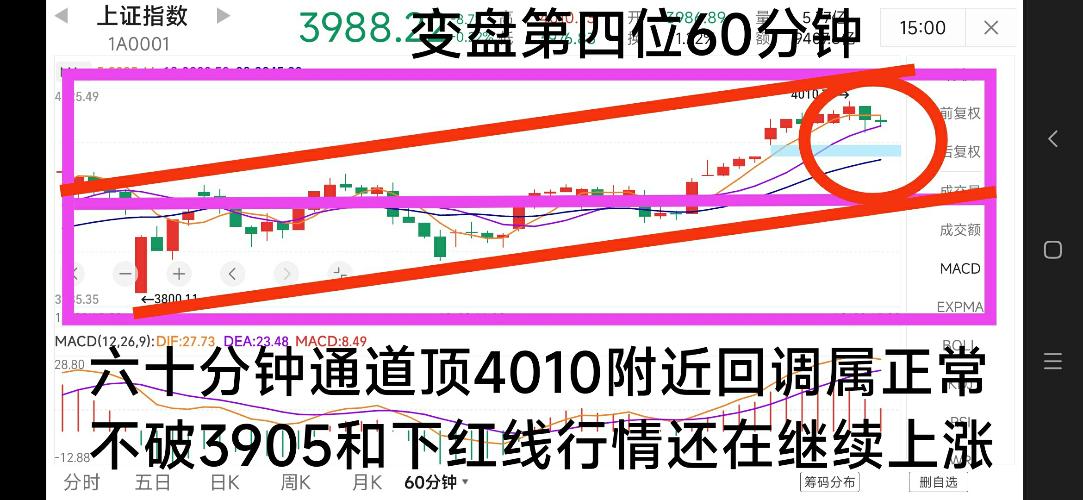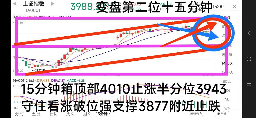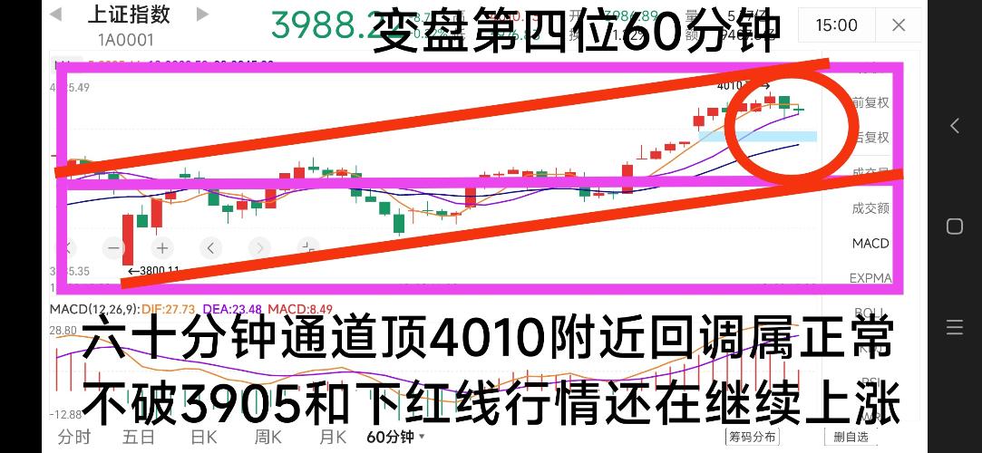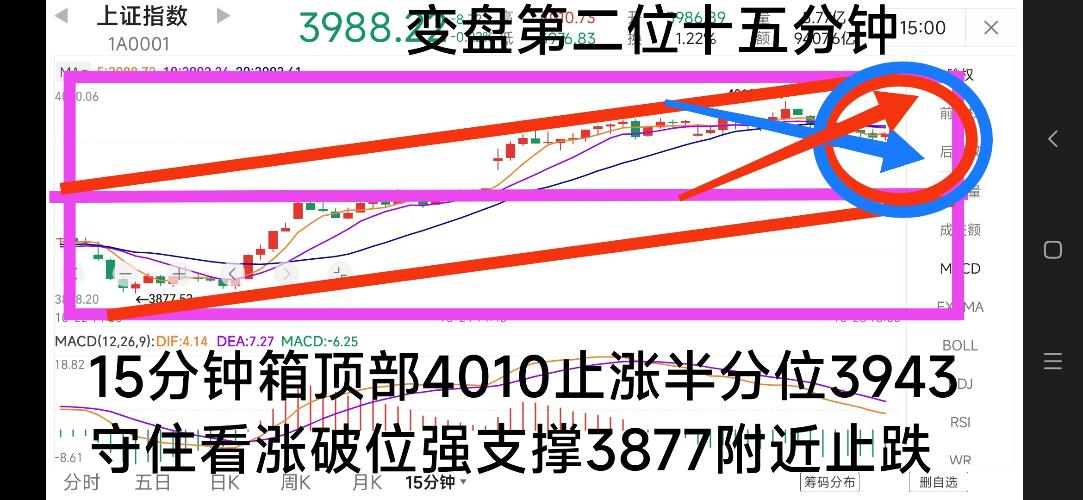 股友们早上好! 大盘分析好增强大家买卖的信心! 九线掌握好在股市赚钱更加稳定! 今把大盘15、60分钟、日、周、季线五种指标的近况向大家介绍,希望你评论和点赞,写好贴更加有信心。 【变盘第二位15分钟图近况分析】 大盘15分钟在小箱体顶部4010开始止涨回落,今天15分钟上冲必须站稳20均线突破箱顶才能继续看涨。 先看五分钟如果再次止涨回调需要做好减仓预防,止跌位应该在3943附近是买入的最好机会...