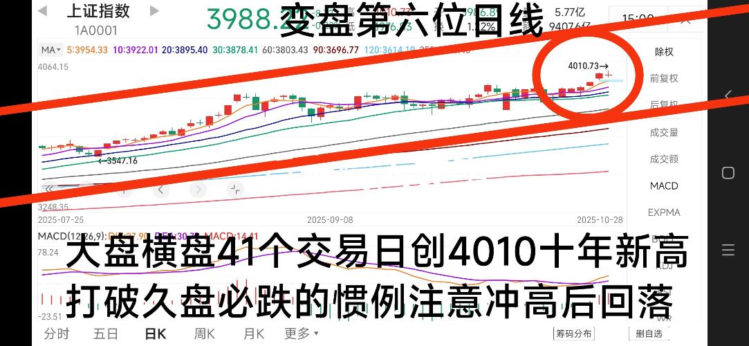 大家晚上好,今晚有三大利好来袭,十五五规划建议发布,今天A股缩量2.1万亿冲高回落微跌8个点,4000点得而复失,明天会怎么走?请认真内心看完,给所有人明确的答案,相信你会豁然开朗的! 第一:今天的A股早盘如期低开上午开始一波震荡上冲最高上冲4010点,但是午后却再一次出现了冲高回落微跌8个点,两市缩量成交2.16万亿,4000点今天得而复失,收出了一根标准的缩量震荡十字星行情,可以说今天就是标准...