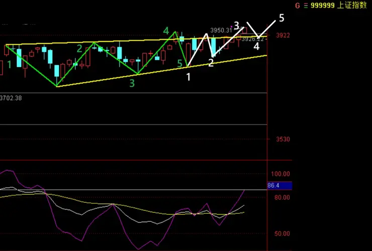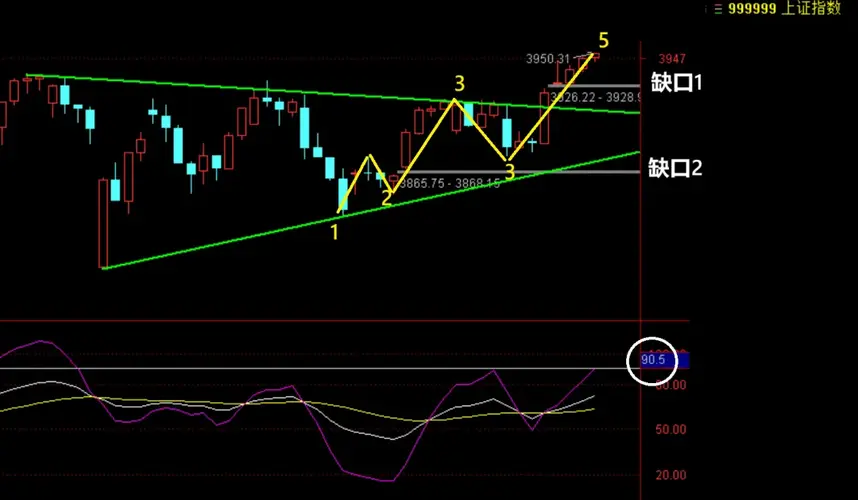 行情点评 言归正传,我们来看下周五的收盘技术形态: 这是上证指数的60分钟走势图。 姜氏KDJ的J值已经上移到了90的高位,从指标的角度看,这里调整的概率越来越大。 日线上这一波短线上涨,是从10月17日大阴柱的最低点展开的,而从60分钟角度看,就是黄色上涨1浪的起始点处。 从黄色的1浪开始计算,目前指数处于上涨第5浪之中,而这个小小的上涨5浪之中,竟然产生了2个跳空高开的缺口,缺口都会回补,就看...