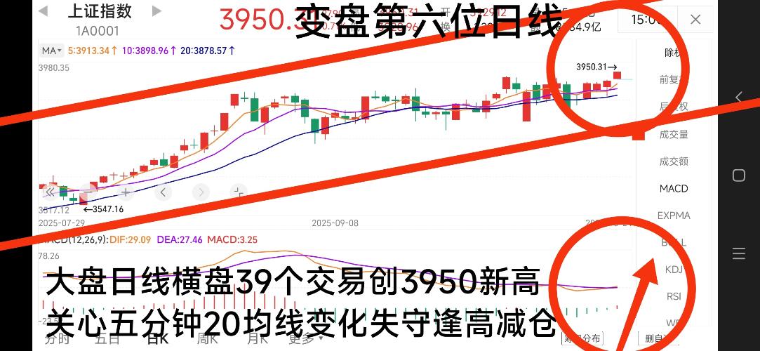 股友们早上好! 大盘分析好增强大家买卖的信心! 九线掌握好在股市赚钱更加稳定! 今天把大盘5、60分钟、日、周、季线五种指标的近况介绍给股友。谢谢你评论和点赞,激励我写好贴信心 【变盘第一位5分钟图近况分析】 今天日线横盘运行第40个交易日,当天操作建议平开或低开风险较小,高开风险较大,虽然打破久盘必跌的常规。但是今天我们也要做好时刻回调的准备,如果五分钟上冲开始止涨之时,赚到钱的个股必须先卖出做...