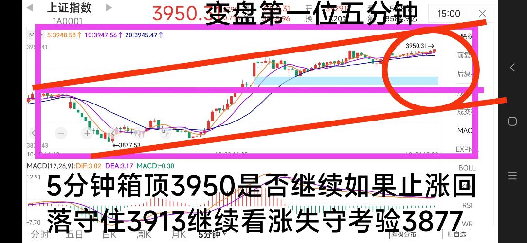 形势太好也要预防冲高回落,如果五分钟开始止涨时,赚到钱须先减仓做预防,回落到五分钟小箱体半分位3913附近开始止跌企稳之时买回。