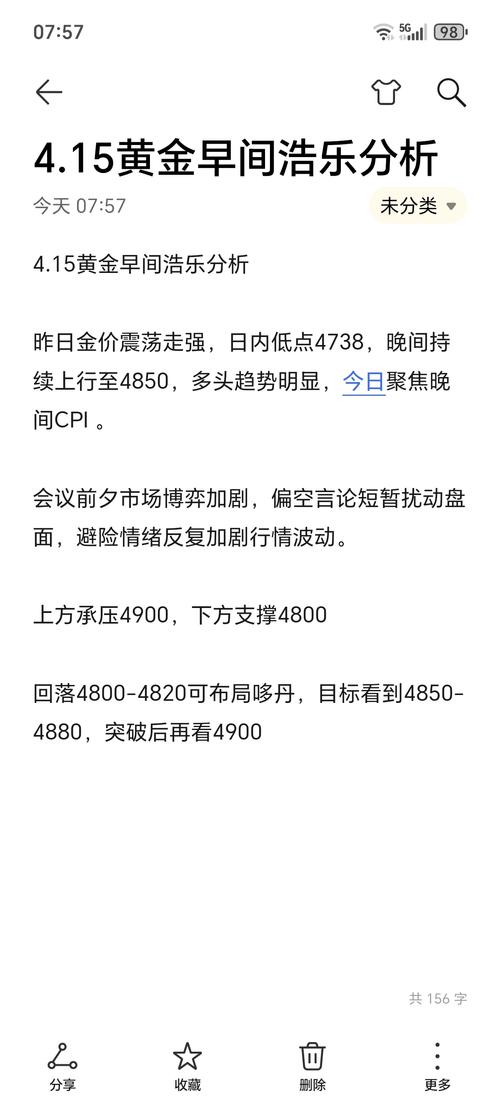4.15黄金早间浩乐分析 昨日金价震荡走强,日内低点4738,晚间持续上行至4850,多头趋势明显,今日聚焦晚间CPI。 会议前夕市场博弈加剧,偏空言论短暂扰动盘面,避险情绪反复加剧行情波动。 上方承压4900,下方支撑4800 回落4800-4820可布局哆丹,目标看到4850-4880,突破后再 看4900