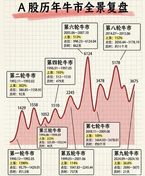 A股30余年的发展历程中,共经历了九轮典型牛市, 第一轮牛市(1990.12—1992.05)上涨幅度:1390% 点位区间:95.79—1429.01 历时:约1.5年 第二轮牛市(1992.11—1993.02)上涨幅度:302% 点位区间:386.85—1558.95 历时:92天 第三轮牛市(1994.08—1994.09)上涨幅度:223% 点位区间:325.89—1052.94 历时:...