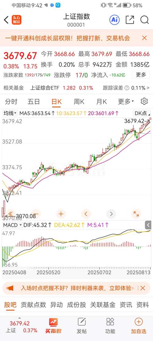 受美股强势拉升影响,A股沪市创下新高,冲破3679,但仅仅是冲破而已,上升势头动能不足。 可以说现在的沪市指数已经到了一个关键时间节点,继续冲动能不足,回调又有违大趋势(内部和外部)何去何从就摆在面前! 个人大胆预测,目前沪市将最有可能走出两种趋势。(个人浅见,大家互相学习) 第一种:不上不下,逼空各路神仙,反复在3670点附近十个点左右的幅度震荡,出又不甘心,守又危机四伏。 第二种:来一到两个4...