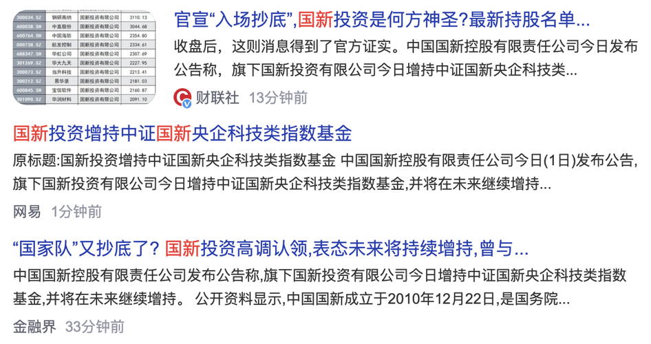 今天的消息面够炸裂。#国家队增持,中特估走强#就在下午的盘中,中证报的一条消息,让大盘在3000点附近展开反攻。$上证指数(SH000001)$打的空头是一败涂地,打的空头是落荒而逃。谁来了?什么消息有这么大的威力。1、中证报:国有资本运营公司进场买入ETF,购入产品多为跟踪央企指数产品。$央企ETF(SZ159959)$$央企红利(SH000825)$最终定格这个国有资本运营公司是中国国新控股...