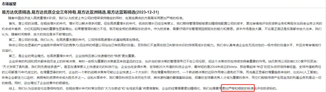 又是一年公募基金年报季,其中备受投资者关注的是管理规模高的基金经理年报。在文章《规模前十基金经理规模之变》里提到,目前管理主动权益类产品规模超500亿的基金经理共3位:张坤、葛兰、刘彦春。这3位基金经理管理的规模曾经上过千亿,也只有这三位主动权益基金经理管理的规模上过千亿,如下图:通过详细阅读这三位基金经理的年报,有三点感悟,在这里与大家分享:感悟一:更严格的标准张坤年报里,在高质量增长的当前,需...