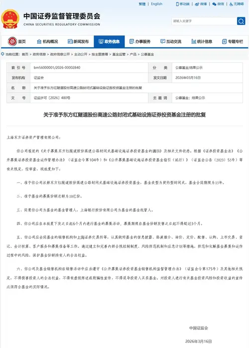 获批小结3月16日,由上海隧道工程股份有限公司作为发起人,上海东方证券资产管理有限公司为管理人的“东方红隧道股份高速公路封闭式基础设施证券投资基金”获得中国证监会准予注册批文,成为2026年首个获批发行的公募REITs项目。在申报过程中,东方红隧道股份高速公路REIT得到了浙江省、杭州市、嘉兴市相关政府部门及浙江证监局的悉心指导与大力支持。本次获批发行实现了多个“首单”突破首单隧道资产公募REIT...