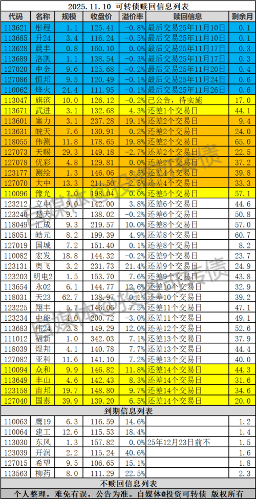 原文发送于昨日晚间自媒体。 武进转债还差一个交易日,正股还需上涨约2.2%,才能满足赎回条件,警惕10日盘后强赎的风险。 塞力转债、皖天转债、伟测转债、天赐转债、优彩转债等5只还差2天满足赎回条件,也危险了。 豫光转债正式发布预计满足赎回条件提示性公告,还差5个交易日满足赎回条件。 众和转债、丰山转债、宙邦转债、国泰转债正股不低于赎回条件价,加入赎回列表,都还差14个交易日满足赎回条件。 华锐转债...