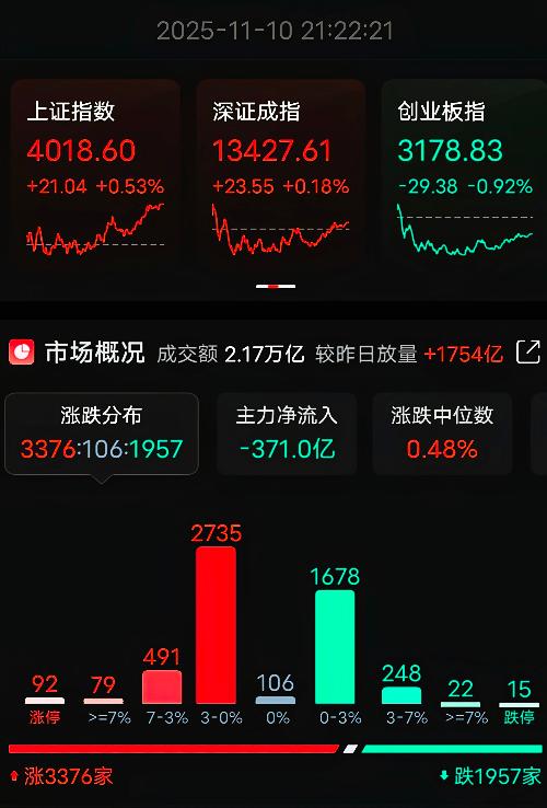 大家晚上好,现在是11月10号深夜,刚刚得知又有五大利好,其中发改委和能源局发布利好政策,今天A股放量中阳上涨21点站稳4000点上方,明天怎么走?今天的内容很重要,请认真耐心看完,相信你会心中有数的! 第一:今天的A股如期探底回升中阳上涨收盘刚好4018,温和放量2.19万亿,两市超过3300家上涨,近百家股票涨停板,所以今天的A股是有部分赚钱效应的,而今天的双创指数却依然收出了阴线回落下跌行情...