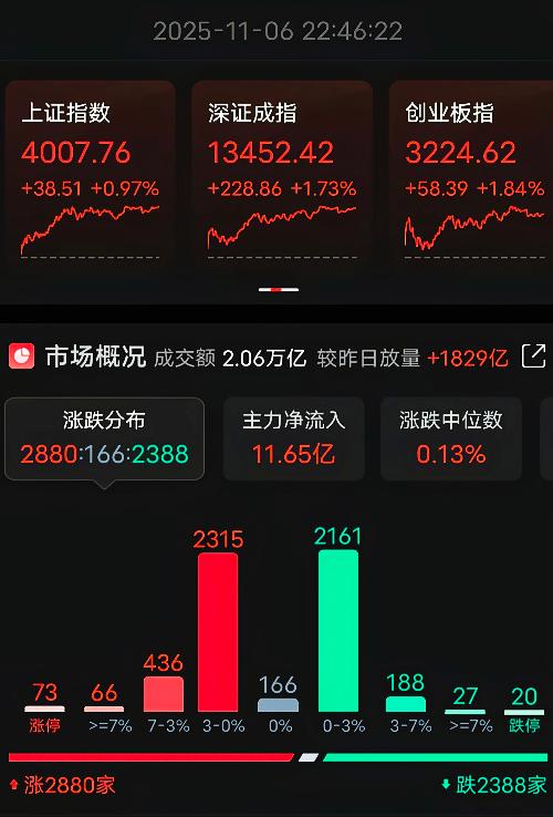 $创业板指(SZ399006)$2025年11月6日股市综合分析 1.大盘整体走势 -指数表现:沪指重返4000点,收于4007.76点(+0.97%);深证成指涨1.73%,创业板指涨1.84%,三大指数同步走强。 -量能与情绪:全市场成交额2.08万亿元,较前一日增加1816亿元,量价配合良好;2880只个股上涨,2388只下跌,市场情绪偏乐观。 -技术面:沪指日线MACD金叉且红柱放大,股价...
