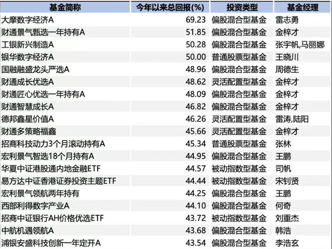 兄弟们,早上好。2025年来了,先祝大家好运连连、账户长红。回顾2024年,公募基金的收益率排名整出来了,看看有没有大家持有的产品。$大摩数字经济混合A$以+69.23%的收益率登顶,$财通景气甄选一年持有期混合A$+51.85%获亚军……从这份榜单来看,我们可以看到一个明确的趋势:1、数字经济行业:随着数字化、网络化、智能化的深入发展,数字经济已经成为推动经济社会发展的新引擎。未来,数字经济行业...