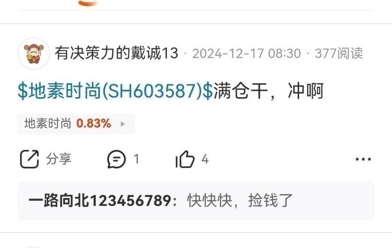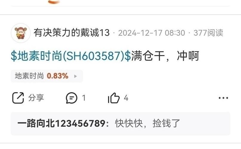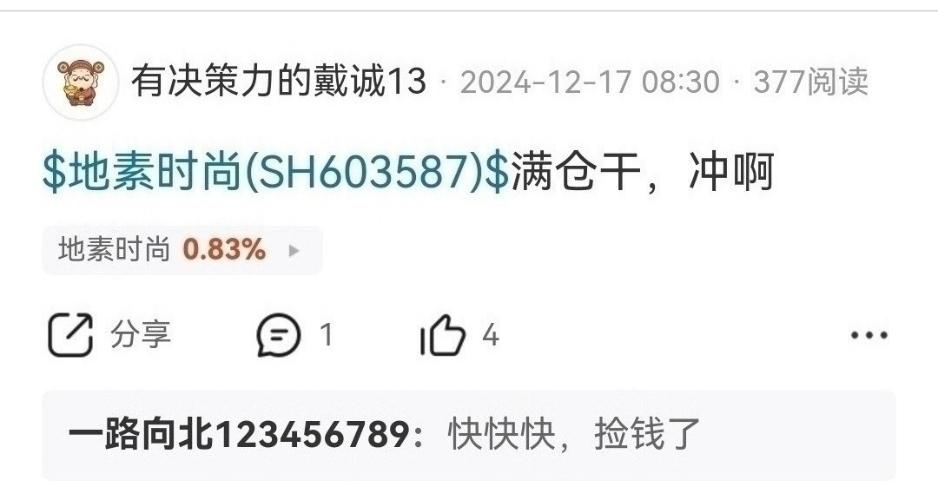 $深港通服装纺织R(SZ483041)$$地素时尚(SH603587)$季线底部中长线至少十倍涨幅,北向资金前年九月十元附近清仓,踏空后唱空攻击人没有必要也没用意义,目前服装板块从前年低点涨幅翻倍,地素时尚补涨空间百分之七十左右,从去年十月十三号服装板块涨幅百分之十五,地素时尚短线补涨空间百分之十左右,北向资金注定踏空了