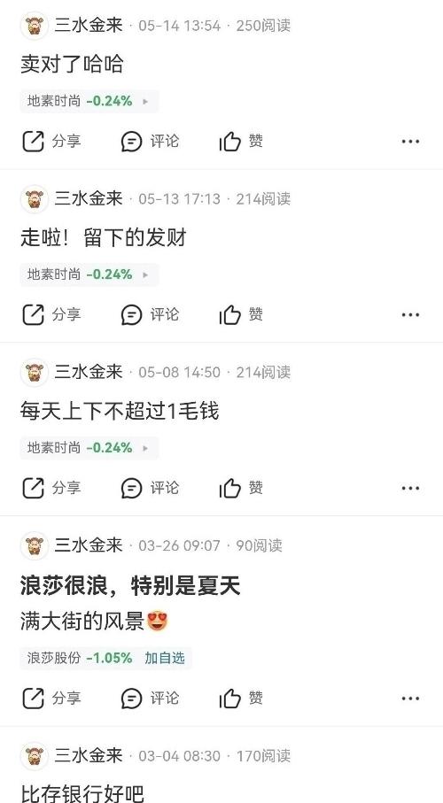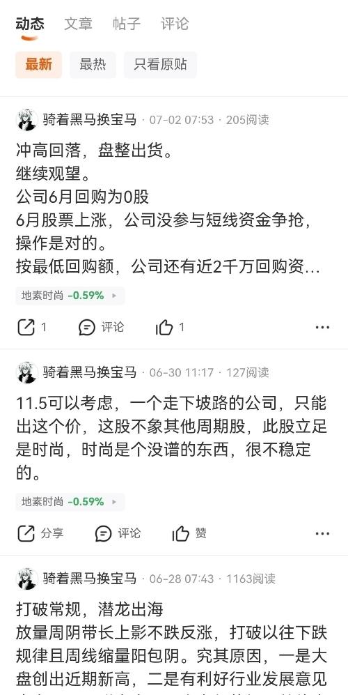 $深港通服装纺织R(SZ483041)$$地素时尚(SH603587)$股票走势都是互补的,地素时尚周线第一浪,第三浪涨幅百分之五十左右,目前涨幅落后服装板块百分之六十以上,周线第五浪必定是主升浪,至少翻倍,季线底部十元卖出踏空后唱空攻击人没有意义,中长线至少十倍涨幅,和泡泡玛特合作业绩大增