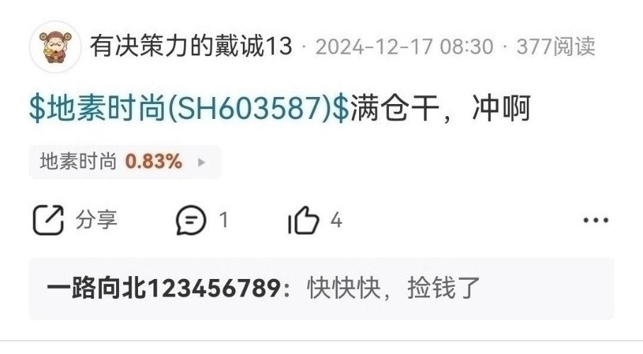 $深港通服装纺织R(SZ483041)$$泰胜风能(SZ300129)$$地素时尚(SH603587)$基本面稳健,业绩反转,和泡泡玛特、只此青绿、迪士尼合作现金流大增百分之百左右(收现增加,实际利润大增),红猫计划整理天猫小红书资源,去年双十一销量大增百分之六十以上,前年四季度业绩低基数二千多万,去年四季度业绩必然大增。扩内需促消费,戴维斯双击形成。 前年九月十八号和服装板块同时形成季线大底反转...