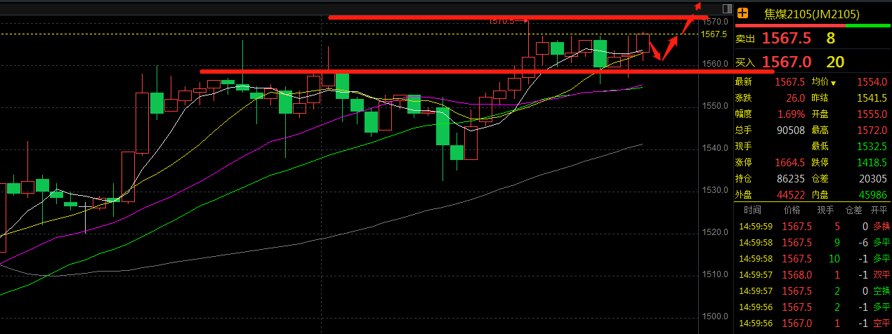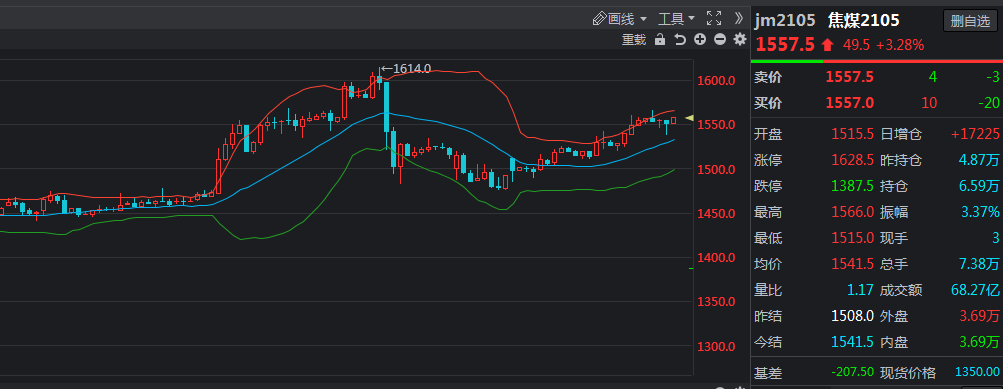 【焦煤】焦煤供需偏紧但涨幅放缓调整目前,终端需求放缓.但近期部分地区煤矿受安全及环保检查影响,产量均有不同程度下滑,其余地区煤矿生产平稳,订单充裕,出货顺畅。优质煤种销售仍保持良好趋势,普遍供不应求,库存处极低状态,煤价上涨至高位后暂稳。焦煤2105:日内增仓上涨录中阳线。终究未能突破前期实体部分。建议1560继续轻仓测试空单。目标1500-1440.防守止损1575.